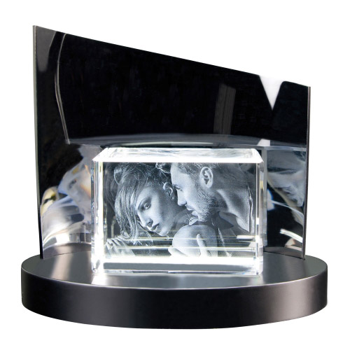 Tipp: Der exklusive Design-Sockel mit Licht ist auch für viele weitere 3D Premiumformen, 3D Glasblöcke, 2D Glasframes und auch farbige Fotos auf Glas erhältlich.