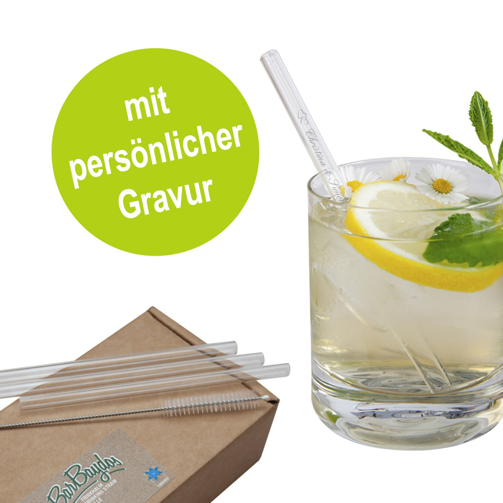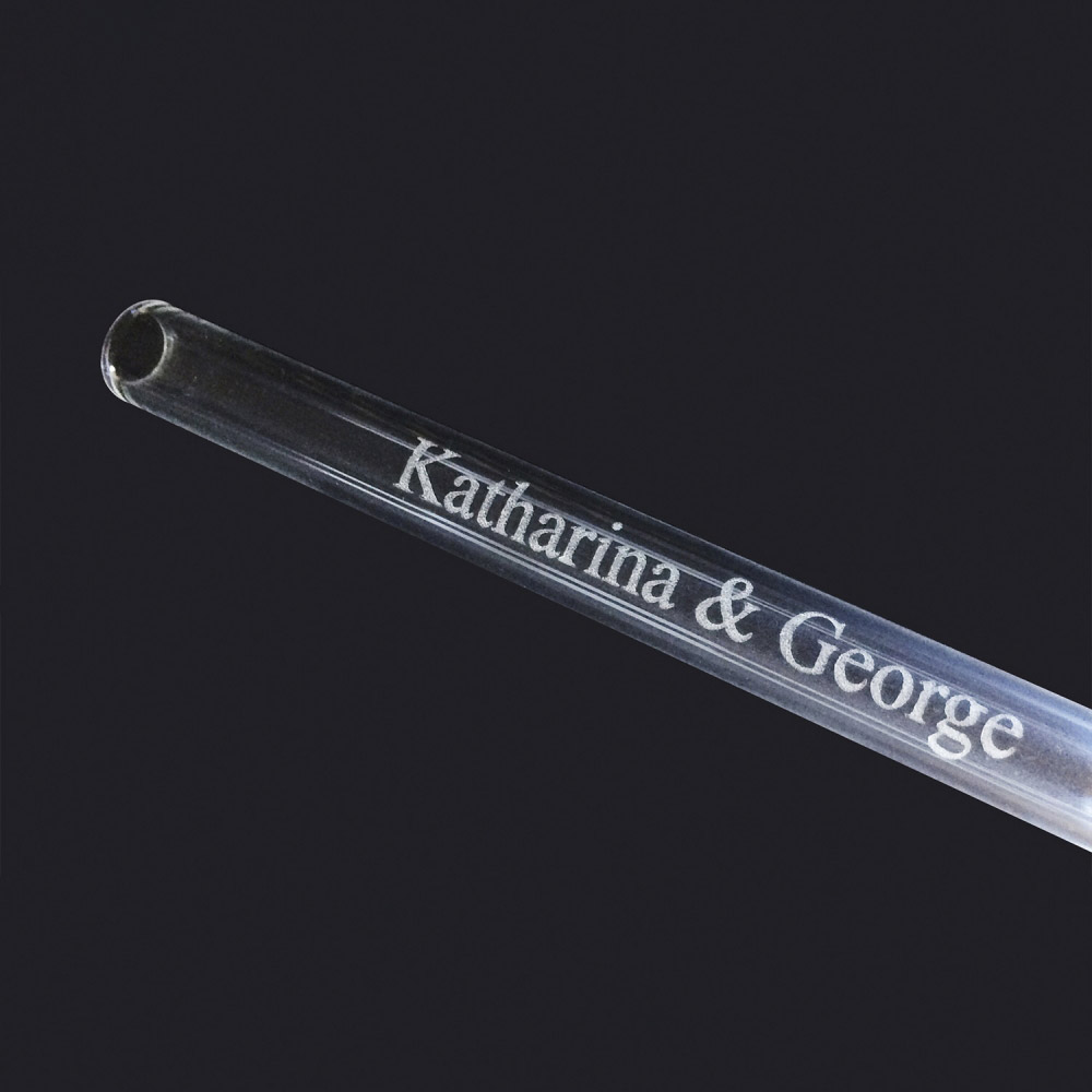 Wir gravieren BarBaydos® Glastrinkhalme mit einem persönlichen Wunschtext, z.B. mit Namen und/oder Datum. So werden die umweltfreundlichen Glastrinkhalme zu einem stilvollen Accessoire für besondere Anlässe, z.B. für Hochzeiten und andere Feierlichkeiten. Ein edles, persönliches Geschenk mit Stil und Nachhaltigkeit.
