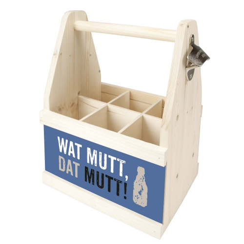 Beer Caddy aus Holz mit einseitigem Motivdruck WAT MUTT, DAT MUTT! Flaschenträger für 6 Bierflaschen, inkl. seitlichem Flaschenöffner aus Metall, Größe 26 x 34 x 17 cm