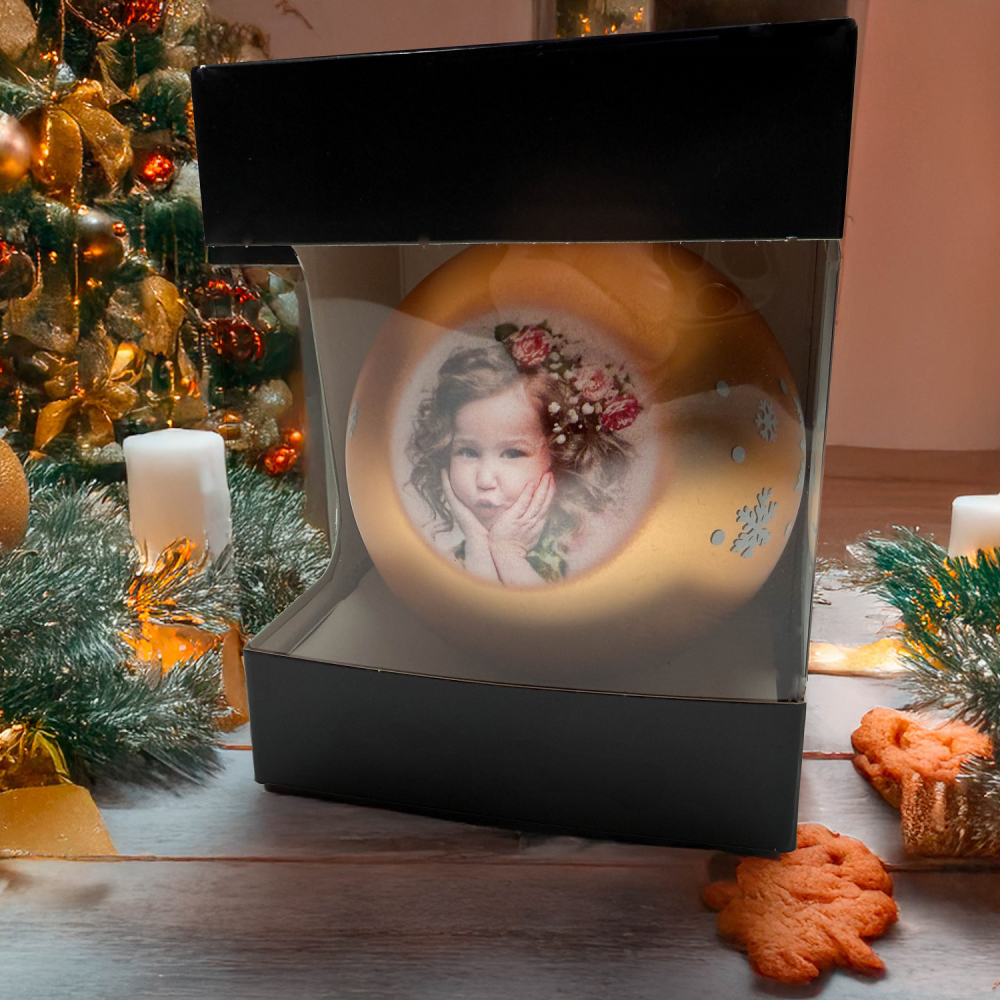 Entdecken Sie die Magie der Weihnachtszeit mit unserer personalisierten Weihnachtskugel aus hochwertigem Glas! Diese edle Glaskugel wird durch Ihr individuelles Foto zu einem einzigartigen Hingucker auf jedem Weihnachtsbaum. Ob als besonderes Geschenk für Ihre Liebsten oder als persönliche Dekoration in Ihrem Zuhause – diese Weihnachtskugel verleiht jedem Raum eine festliche Atmosphäre.