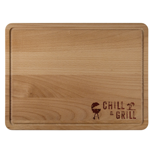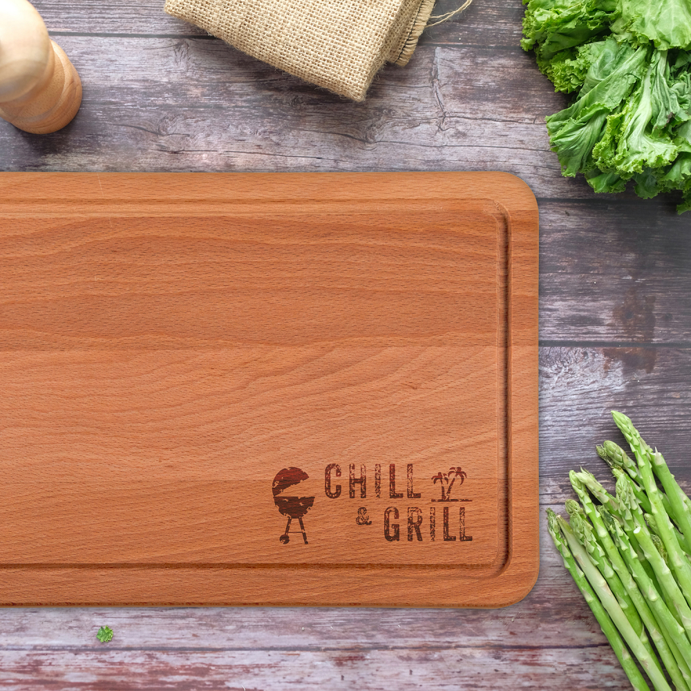 Dieses massive Schneidebrett mit Saftrille lässt das Herz aller Küchenfans höherschlagen! Graviert mit dem Motiv "Chill & Grill" ist das Holzbrett ein absoluter Hingucker und bringt gute Laune in die Küche und auf den Tisch.