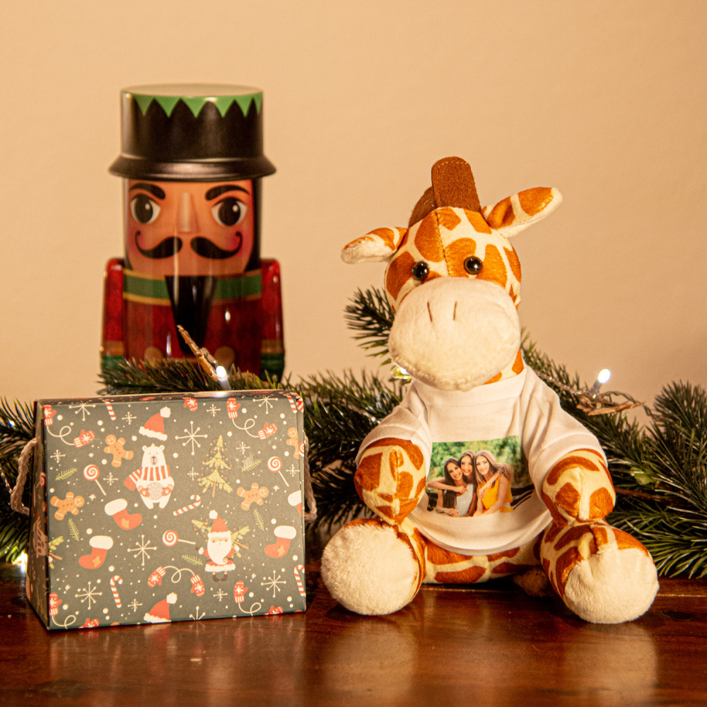 Die Foto-Giraffe trägt Ihr Wunschfoto auf dem T-Shirt und ist ein netter kleiner Begleiter. Das Kuscheltier ist nicht nur zum präsentieren eines Bildes gedacht. Nehmen Sie sich in einsamen Stunden die Giraffe und kuscheln drauf los.