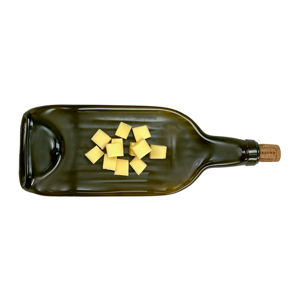 Durch Upcycling wird diese stylische Servierplatte aus alten Weinflaschen hergestellt, die durch eine spezielle Glasschmelztechnik - dem Glasfusing - zu einzigartige Unikate für Dich werden.
