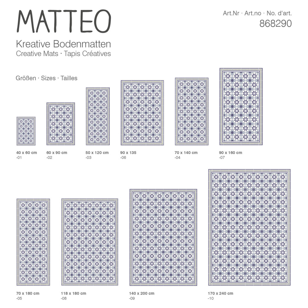 MATTEO Vinyl-Bodenmatten sind in vielen Formaten und Größen erhältlich: als Fußmatte für den Eingangsbereich, Läufer im Flur oder Teppich in unterschiedlichen Abmessungen für Wohnräume.