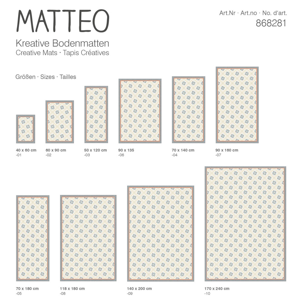 MATTEO Vinyl-Bodenmatten sind in vielen Formaten und Größen erhältlich: als Fußmatte für den Eingangsbereich, Läufer im Flur oder Teppich in unterschiedlichen Abmessungen für Wohnräume.