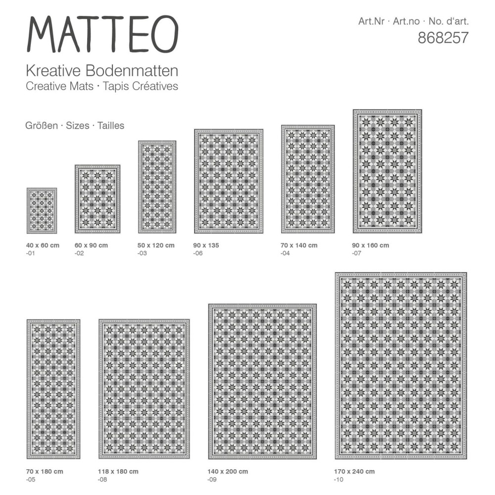 MATTEO Vinyl-Bodenmatten sind in vielen Formaten und Größen erhältlich: als Fußmatte für den Eingangsbereich, Läufer im Flur oder Teppich in unterschiedlichen Abmessungen für Wohnräume.