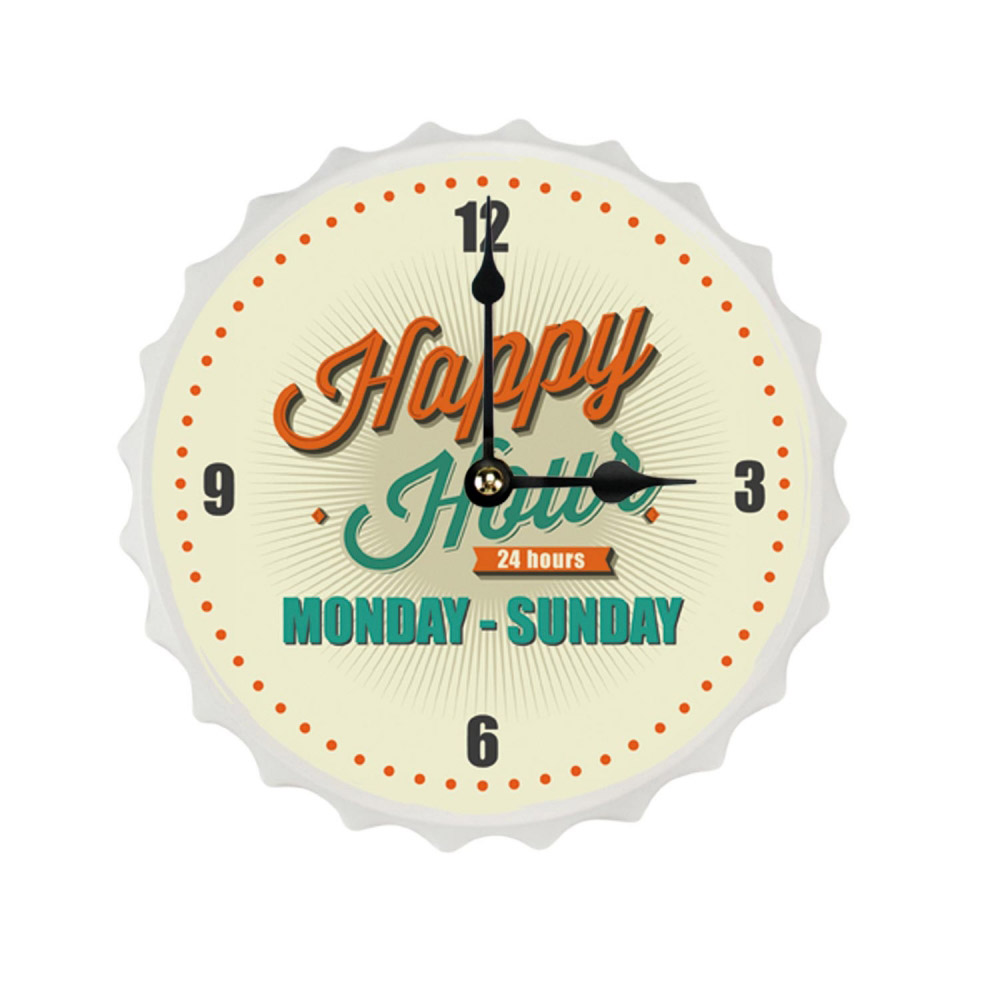 Die Wanduhren aus pulverbeschichtetem Metall sind mit liebevoll gestaltetem Retro-Design "Happy Hour - 24 hours - Monday-Sunday" bedruckt. Die hübschen Uhren gibt es in zwei Größen: eine große Variante mit einem Durchmesser von Ø 33 cm (Größe L) sowie eine etwas kleinere Variante mit einem Durchmesser von Ø 20 cm (Größe M). Die Uhren werden jeweils mit einer Batterie betrieben (1 x Mignon AA - nicht im Lieferumfang enthalten).