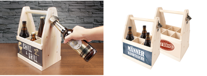 Der BEER CADDY aus europäischem Holz mit coolen Sprüchen lässt das Herz eines jeden Biertrinkers höherschlagen: Mit ihm lassen sich sechs Bierflaschen einfach transportieren, ohne dabei ins Schwitzen zu kommen. Der seitlich fixierte Flaschenöffner für Kronkorken ist dabei immer zur Stelle. Viele verschiedene Designmotive in unterschiedlichen Farben stehen zur Auswahl – so findet sicher jeder seinen BEER CADDY!