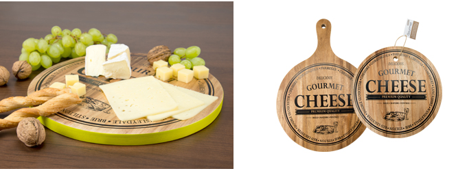 Das praktische Servierbrett ist in verschiedenen Ausführungen erhältlich. So gibt es das GOURMET Holzbrett in der Größe Ø 26 x 1,5 cm (ohne Griff), in der Größe Ø 30 x 1,5 cm (ohne Griff), in der Größe 36 x 25 x 1,5 cm (mit Griff) sowie in der Größe 42 x 29 x 1,5 cm (mit Griff).