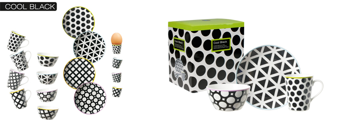 COOL BLACK ist aus Porzellan gefertigt und für die Spülmaschine und Mikrowelle geeignet. Die Serie umfasst Kaffeebecher (Höhe 10,5 cm, 330 ml), Dessert-Teller (Ø 19,6 cm), Müslischalen (Ø 14 cm, Höhe 7,2 cm) und Eierbecher (Höhe 4,6 cm), die jeweils als 4er-Set mit vier unterschiedlichen Schwarz-Weiß-Designs in einer ansprechenden Geschenkbox verpackt sind.